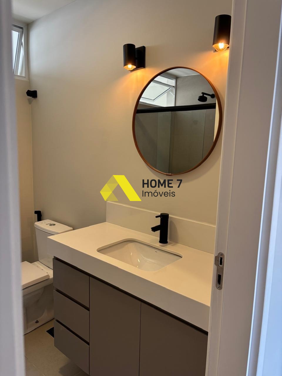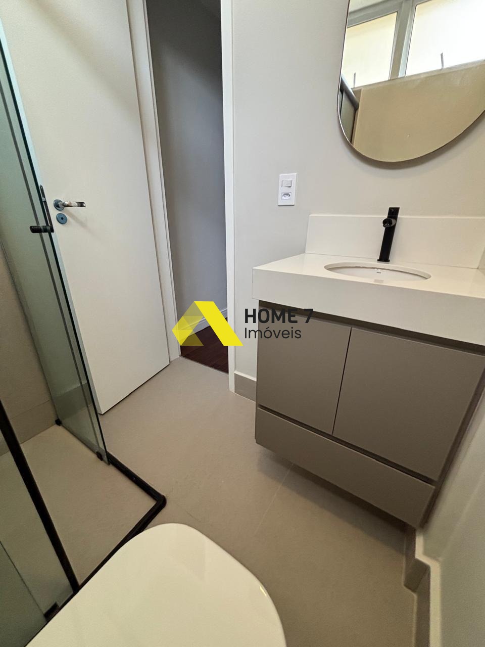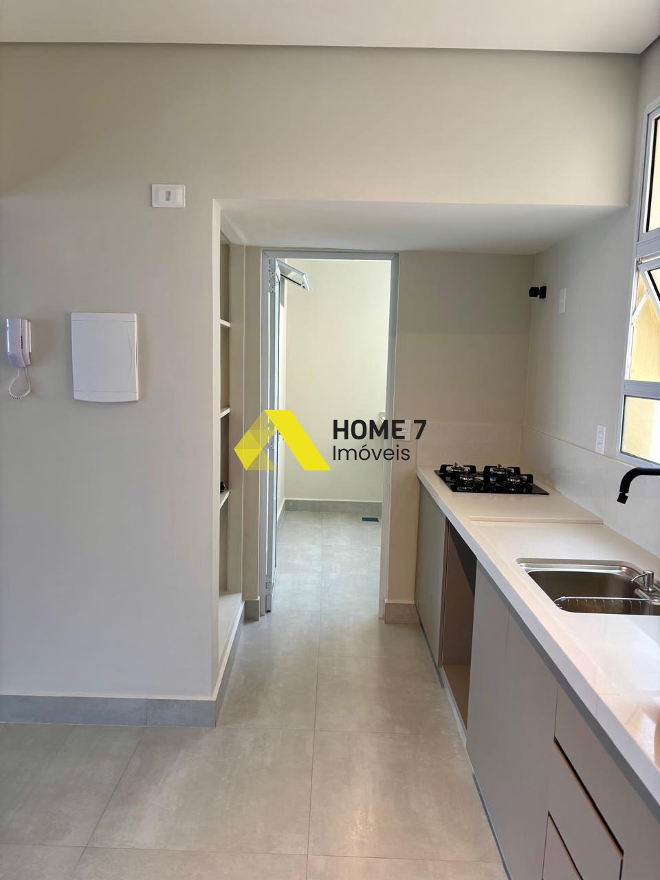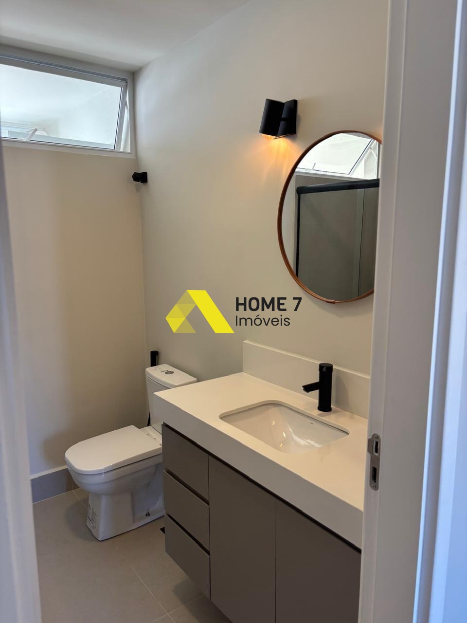 Banheiros, cozinha + área de serviço piso com porcelanato cinza.