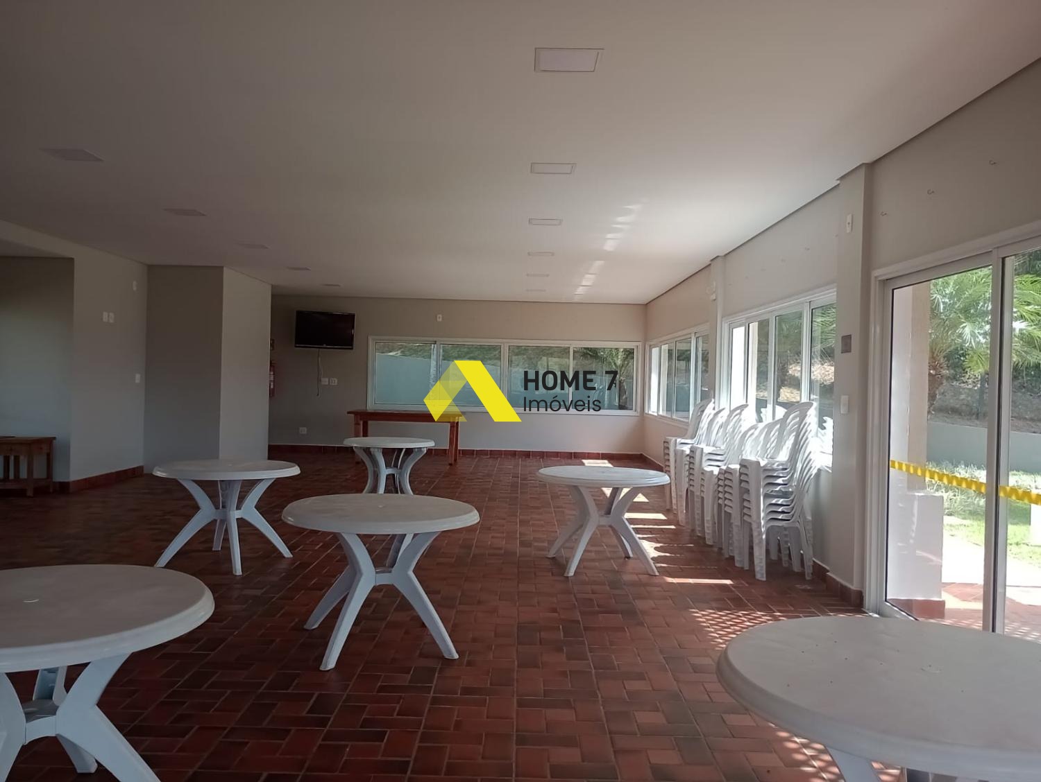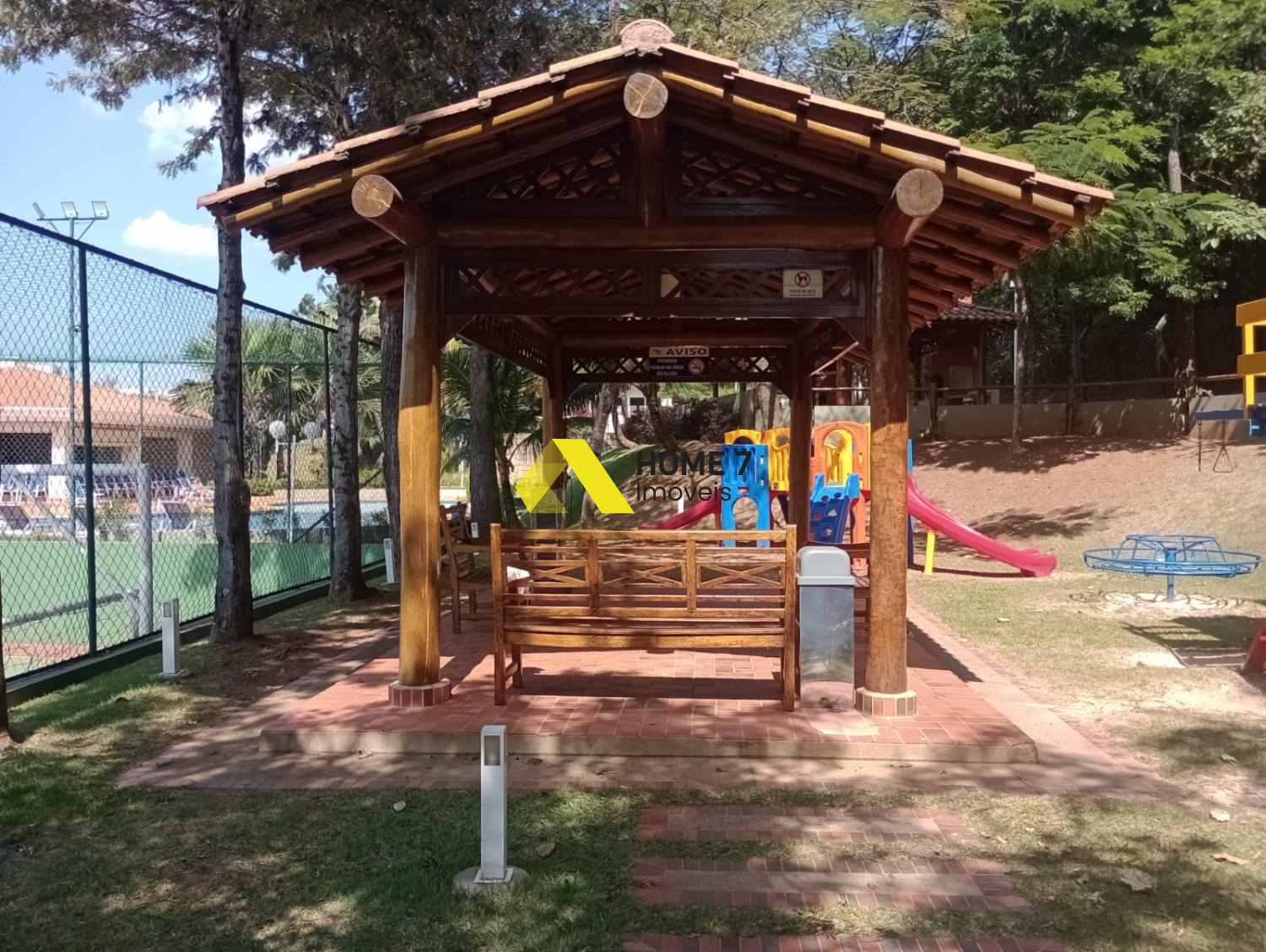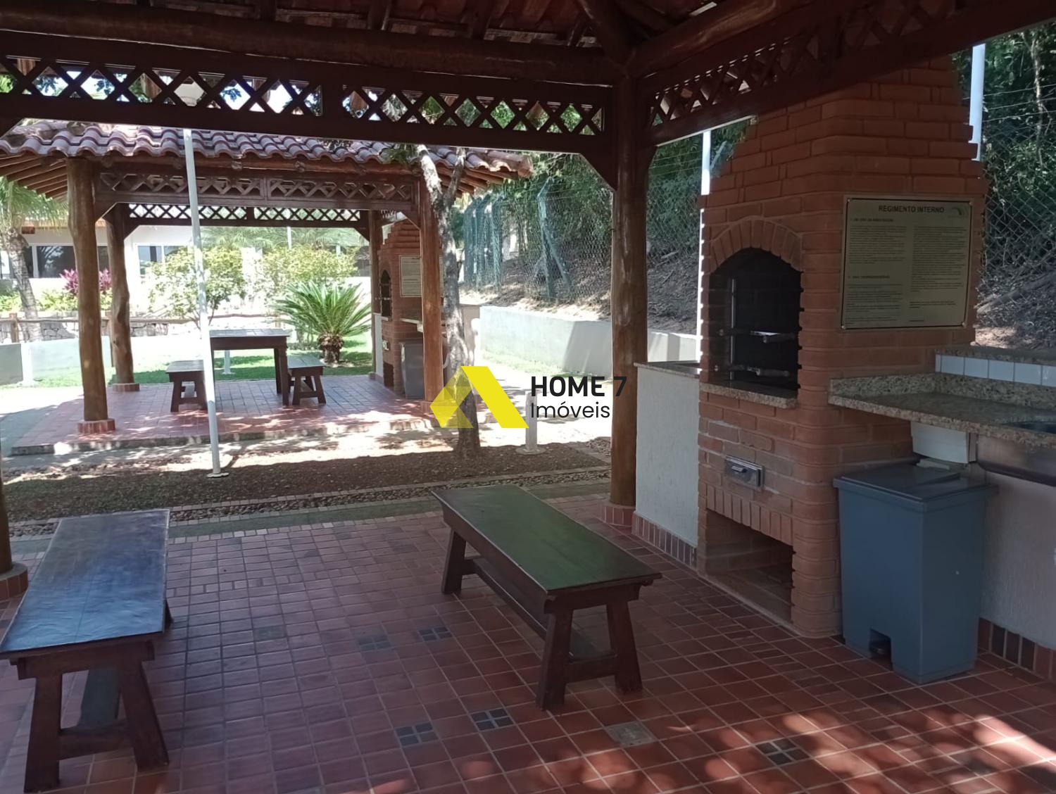 A Sala de TV ou mesmo uma sala de Jantar tem vista para a Varanda com Pergolado em madeira, agregando com espaço do quintal e gramado com plantas .