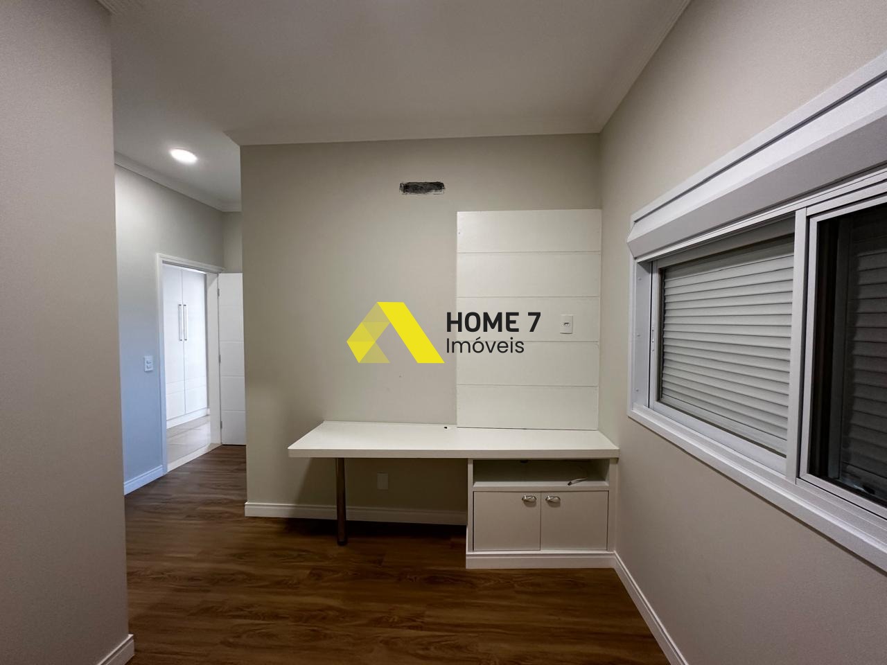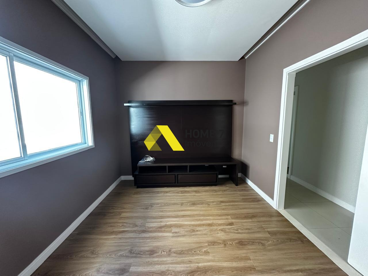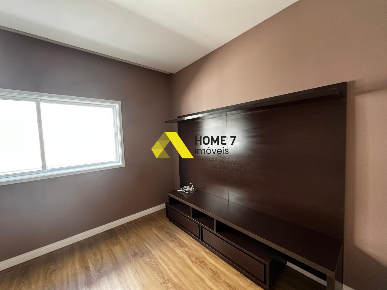 Possui um Home Cinema com painel em Madeira Marrom.