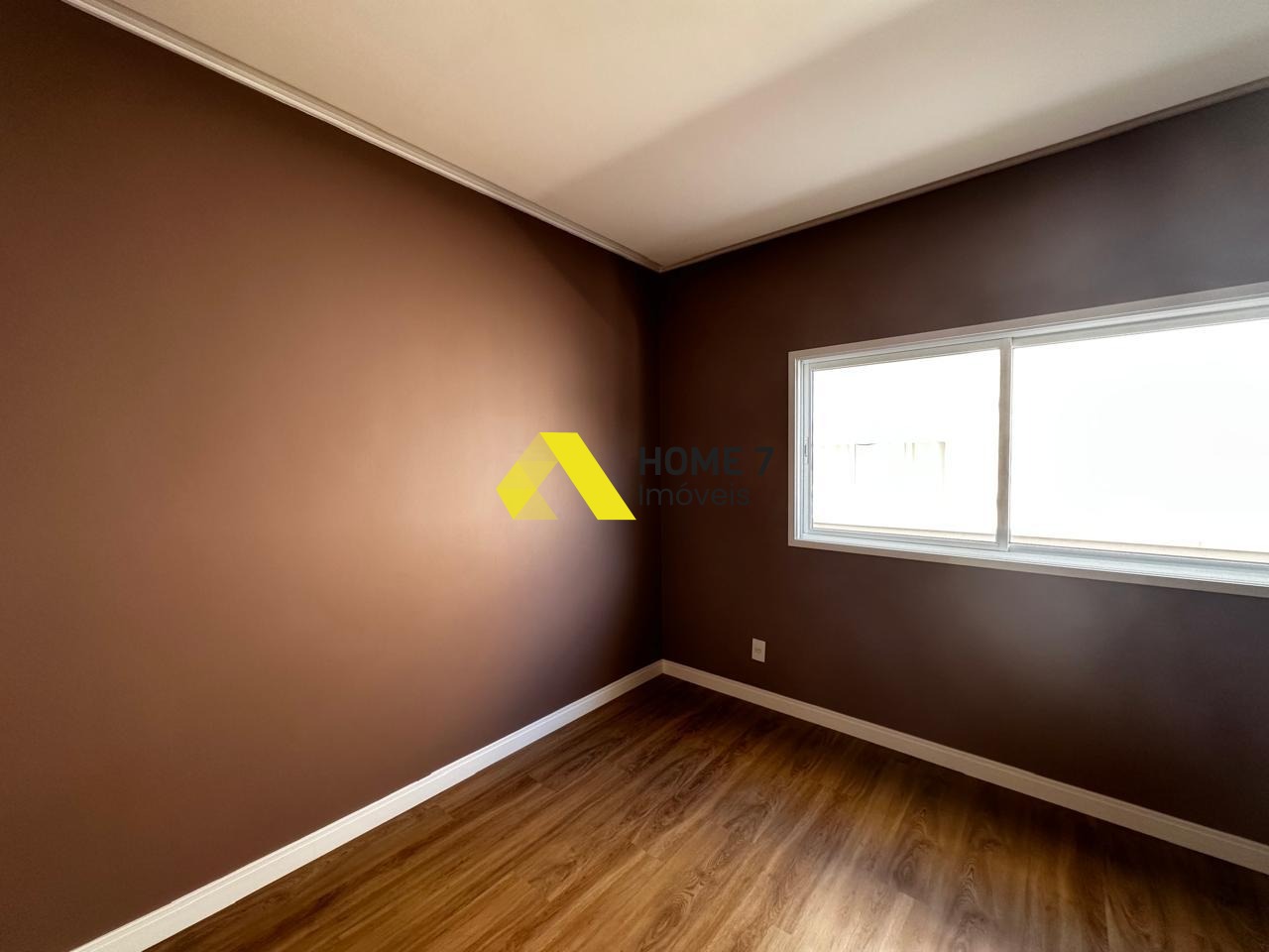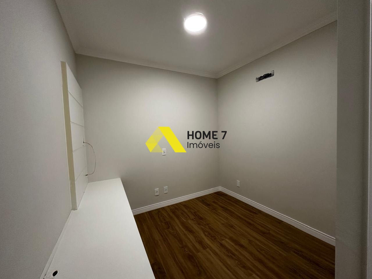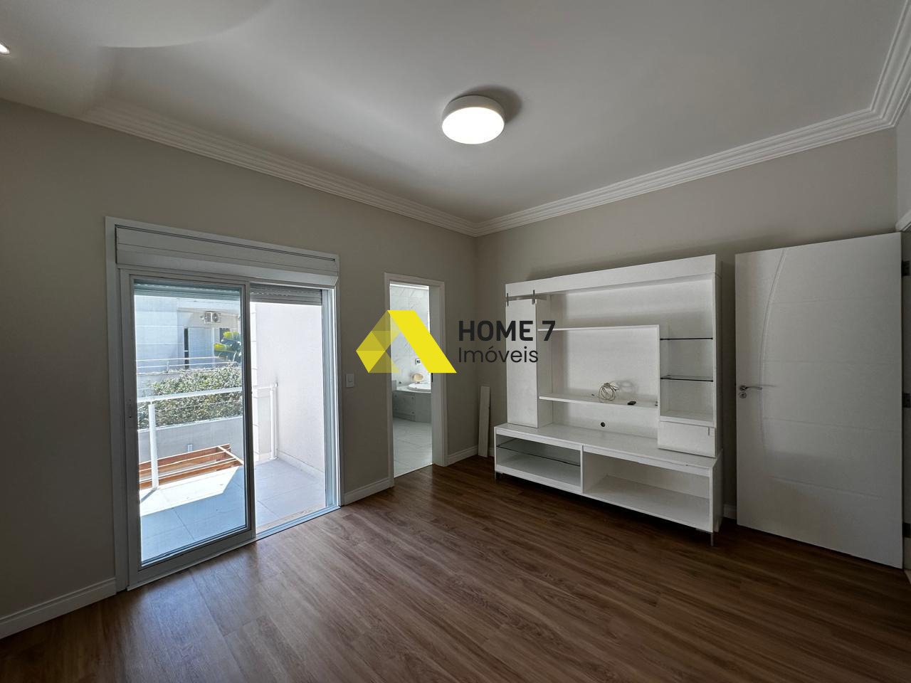 Possui um Home Cinema com painel em Madeira Marrom.
